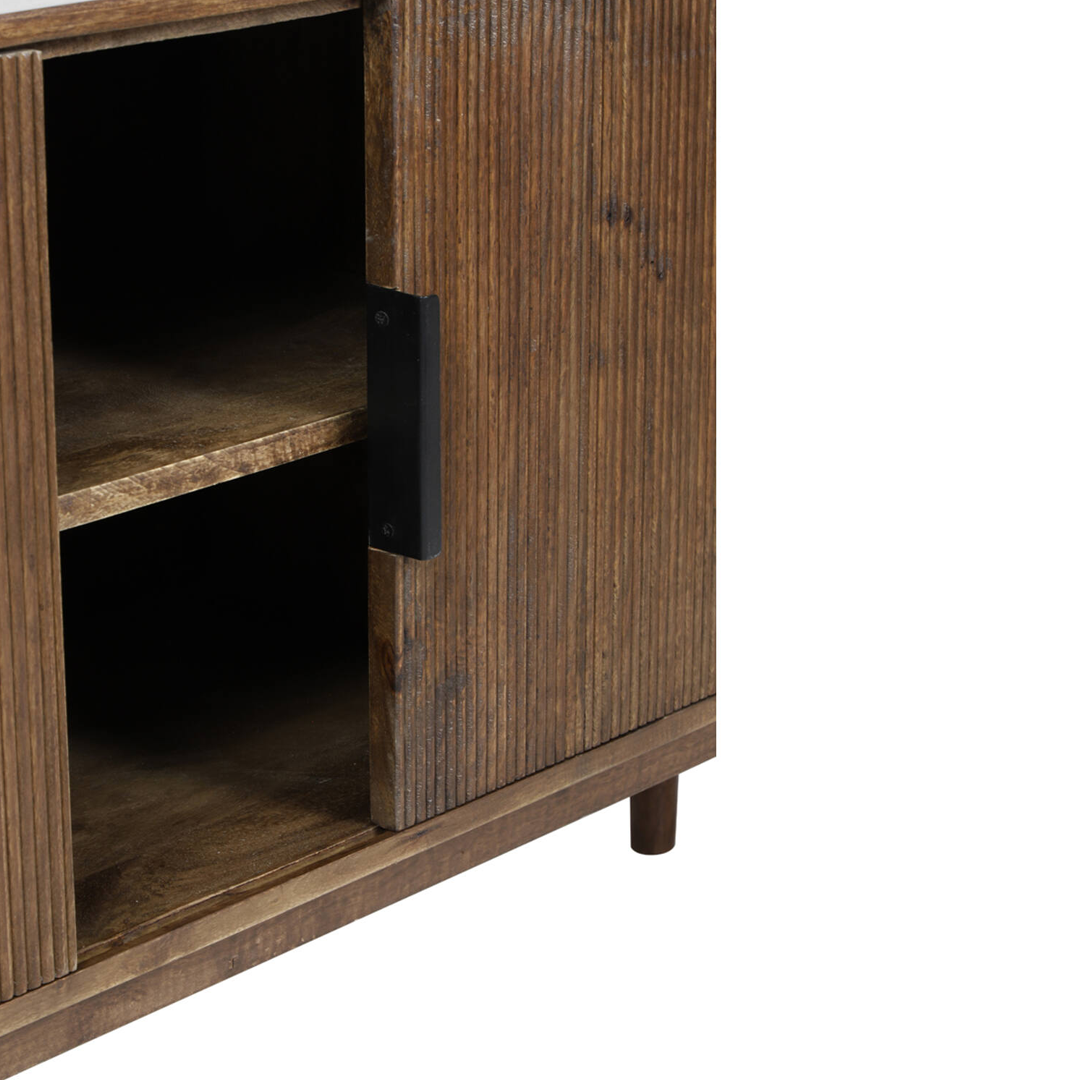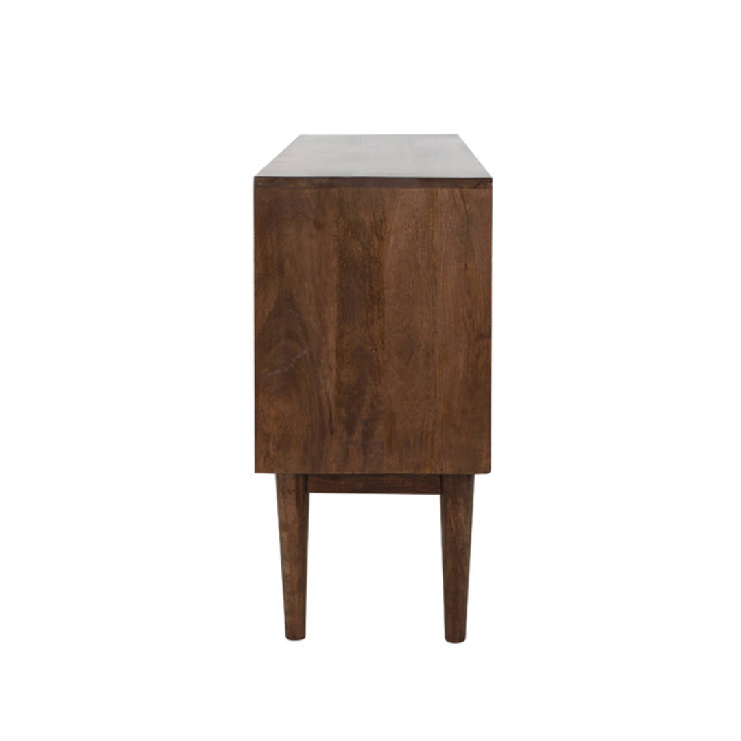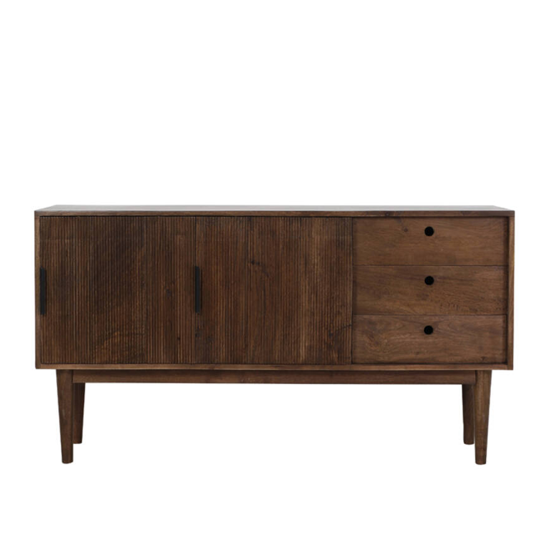Aparador em madeira castanha escura com duas portas de correr e três gavetas.