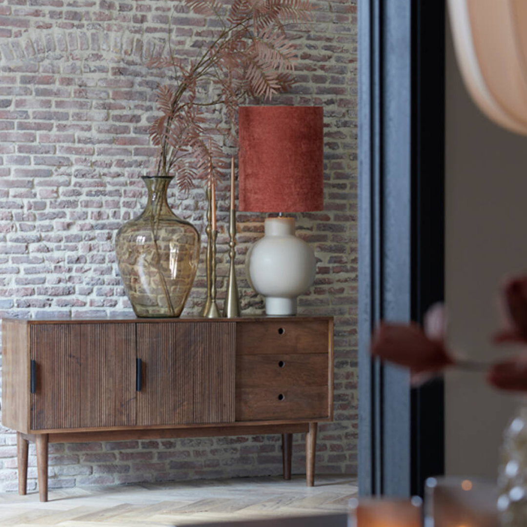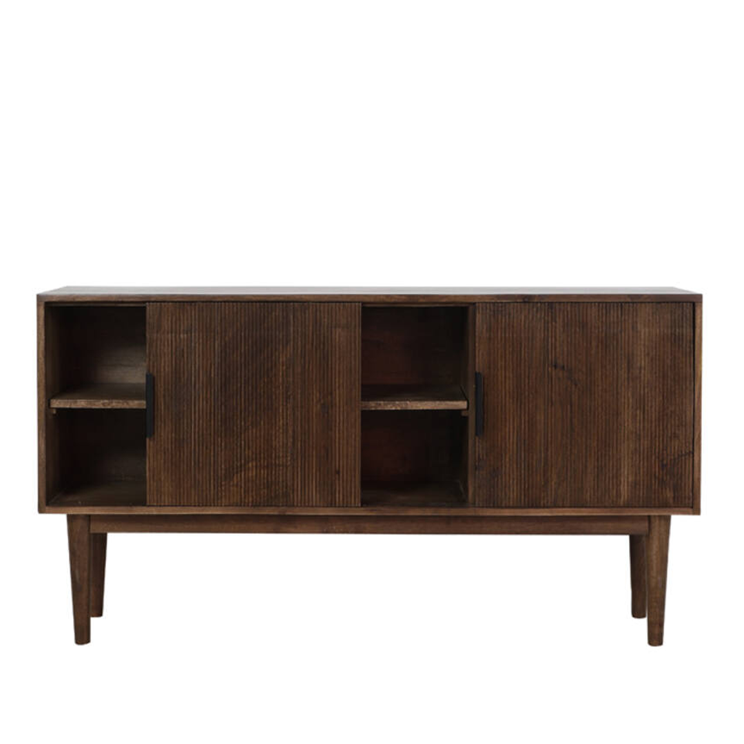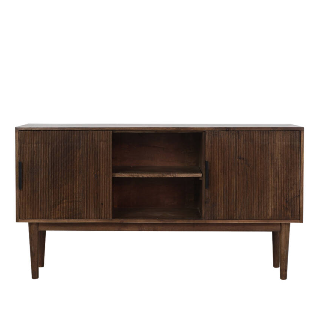 Aparador em madeira castanha escura com duas portas de correr e três gavetas.